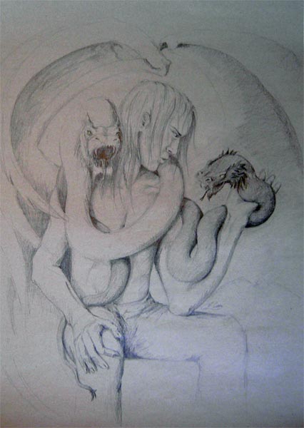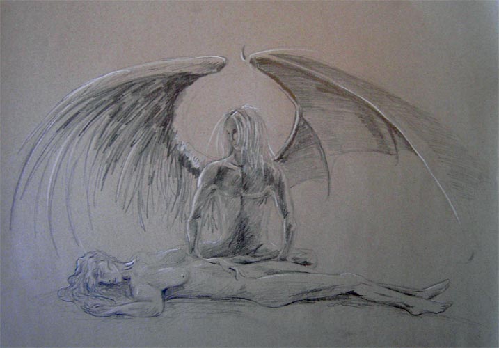 Hier mein erstes und absolutes Lieblingsbild. Es hängt inzwischen schön gerahmt bei mir daheim. Es stellt eine wiederkehrende Figur in meinen Zeichnungen dar. Ein Wächter für mich mit einem Engel und einem Drachenflügel um zu zeigen, dass nichts nur gut oder nur böse ist sondern alles dazwischenliegt.